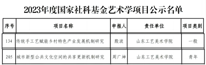 近日,文化和旅游部科技教育司、全国艺术科学规划领导小组办公室发布《关于2023年度国家社科基金艺术学项目立项名单的公示》,全国共有235个项目进入公示。76net必赢官网殷波老师的《传统手工艺赋能乡村特色产业发展机制研究》、周广坤老师的《城市新型公共文化空间的共享更新机制研究》分别入选2023年度国家社科基金艺术学一般项目和青年项目立项名单。