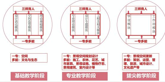 通过三大阶段八大模块的递进式培养体系培养学生一专多能的就业优势,精通景观设计专业知识和专业技巧,同时还能掌握相关专业的专业原理和一般技能,适应策划、规划、运营、设计、文旅、施工、管理、旅游、农林、花艺、空间设施、公共艺术等社会和岗位的多种需求。