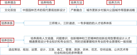 景观设计专业以为人民服务为培养宗旨,以文化双创为培养理念,以中国园林艺术的现代景观创新设计为培养特色,以产教融合为培养方法,积极对接城市更新、乡村振兴、公园城市等国家建设战略需求,通过三师育人、三阶递进、一专多能的人才培养体系,培养具有人文底蕴、问题意识、创新精神和工匠精神的景观设计师,精通景观设计专业知识和专业技巧,同时还能掌握相关专业的专业原理和一般技能,适应策划、规划、运营、设计、文旅、施工、管理、旅游、农林、花艺、空间设施、公共艺术等社会和岗位的多种需求。