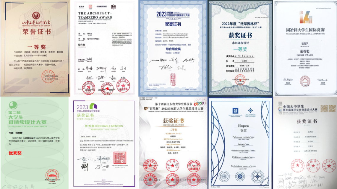 教师团队理论与实践并重,首先在教学和科研方面成果丰富,教师近年来参与国家社会科学基金艺术学项目1项,主持国家级协同育人项目1项,主持或参与省部级教科研课题10余项、厅局级课题6项;出版专著3部、教材2部;发表学术论文30余篇,其中核心期刊论文5篇;专利成果转化5项;作品入选全国美展等建筑艺术作品展6人次;获山东省大学生科技节建筑设计大赛优秀指导教师奖等教学获奖若干。
